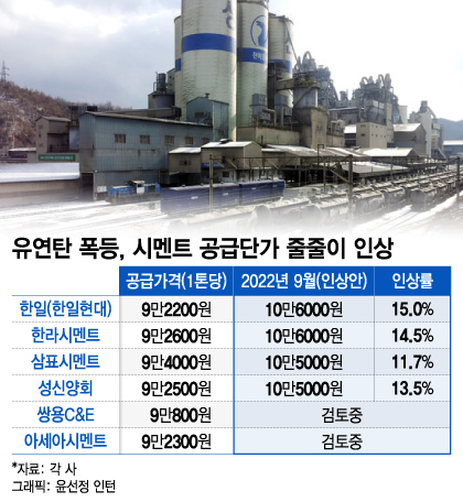 한일그룹(한일시멘트·한일현대시멘트)과 삼표시멘트, 성신양회이 앞서 가격인상 계획을 공개했다. 한일시멘트와 한일현대시멘트는 1톤당 9만2200원에서 10만6000원으로 15%인상계획을 밝혔고 성신양회도 13.5%, 삼표시멘트는 11.7%씩 공급단가를 올린다. 쌍용C&E와 아세아시멘트도 내부 검토를 진행 중인 것으로 파악된다.