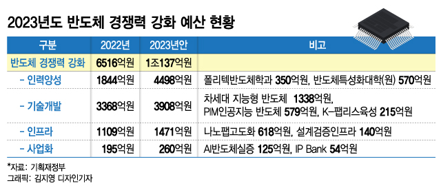 정부가 30일 국무회의에서 의결한 '2023년도 예산안'에 따르면 내년도 반도체 경쟁력 강화를 위해 편성한 예산은 총 1조137억원이다. 반도체 인력양성 예산 4498억원(44.4%)을 제외하면 △기술개발(3908억원) △인프라(1471억원) △사업화(260억원) 등에 5639억원이다. 이는 내년도 총지출(639조원)의 0.1%에도 못미치는 수준이다.