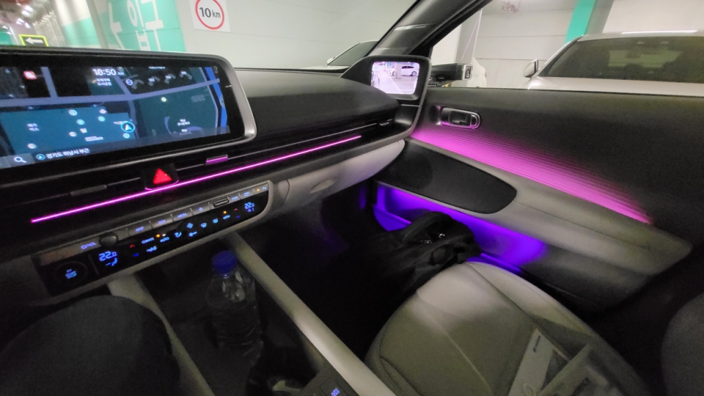 기존 현대차그룹에선 없었던 새로운 시도도 돋보였다. 센터콘솔을 평평하게 만들어 그 위 노트북을 놓고 개인 공간으로도 쓸 수 있게 만들었고, 창문 스위치도 한곳으로 모았다. 덕분에 앰비언트 라이트가 더욱 돋보였다.