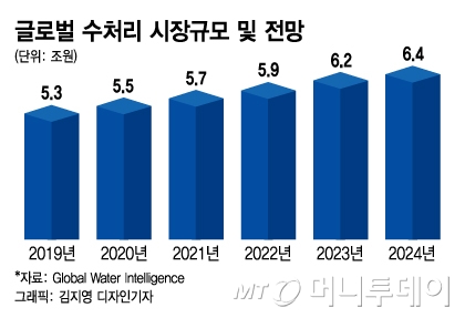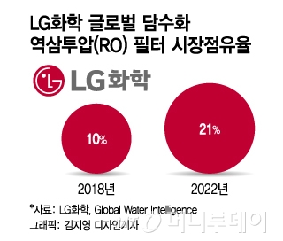 6일 관련업계에 따르면 LG화학은 해수담수화 역삼투압(RO)필터 분야 글로벌 시장점유율 2위로 도약했다. 글로벌 수처리 조사기관 GWI(Global Water Intelligence)와 LG화학 내부 조사자료에 따르면, LG화학은 해수담수화 RO필터 시장점유율은 21%다. 일본 도레이에 이어 2위다. LG화학이 해수담수화용 RO필터 분야에서 확고한 입지를 구축하게 됐다. 글로벌 수처리 시장은 2019년 5조3000억원에서 2024년 6조4000억원으로 연평균 3.9% 성장세를 이어가고 있다.