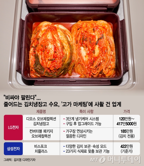 김장의 계절이 돌아오면서 가전업계가 본격적인 '고가 김치냉장고' 마케팅에 나섰다. 400만원대를 웃도는 비싼 제품이지만 김치 보관 성능은 물론 '서브 냉장고'(2번째 냉장고)로 활용할 수 있는 여러 스마트 기능을 겸비했다. 가전 시장이 위축되고 김장을 직접 담가 먹는 가정이 줄면서 감소한 김치냉장고 수요를 견인하기 위한 프리미엄 마케팅이다.
