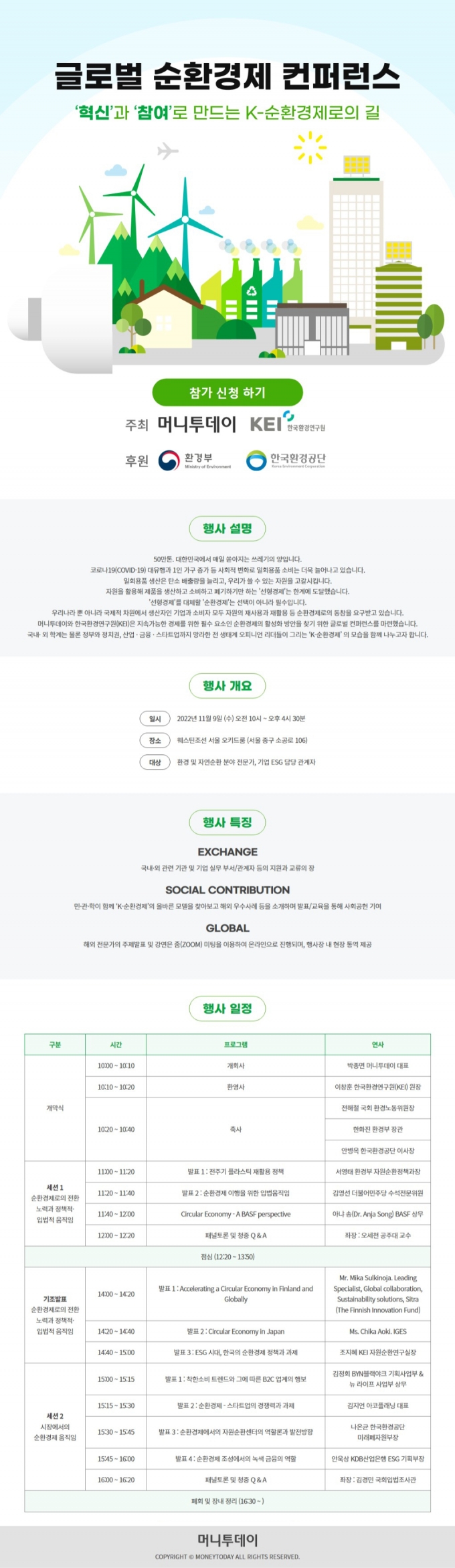 이에 머니투데이와 한국환경연구원(KEI)은 환경부와 한국환경공단의 후원을 받아 지속가능한 사회를 위한 필수 요소인 순환경제의 활성화 방안을 찾기 위한 글로벌 컨퍼런스를 9일 개최합니다.