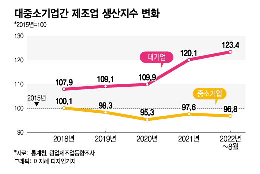 7일 통계청에 따르면 지난 8월까지 대기업 생산지수는 123.4인데 반해 중소기업은 96.8에 그친다. 제조업 생산성지수는 2015년을 100으로 보고 현 시점의 생산성을 비교하는 수치인데, 대기업과 중소기업간 제조업 생산지수가 2015년 지수도입 이후 가장 큰 격차를 보였다. 300인 이상 대기업에 52시간제를 적용한 2018년 대기업과 중소기업의 생산지수는 각각 107.9와 100.1이었다. 하지만 50인 이상 300인 미만 중소기업에 적용된 2020년에 이르자 생산지수는 109.9와 95.3으로 차이가 나기 시작했다. 50인 미만 사업장 도입이 적용된 지난해 7월 이후엔 대기업의 생산지수가 큰 폭으로 오른 반면, 중소기업은 제자리걸음을 걸었다. 연초부터 적용된 올해에는 그 폭이 더 넓어졌다. 기초체력이 튼튼한 대기업은 주52시간제에 잘 적응했던 반면 허약한 중소기업은 영향을 많이 받았던 것으로 해석된다.