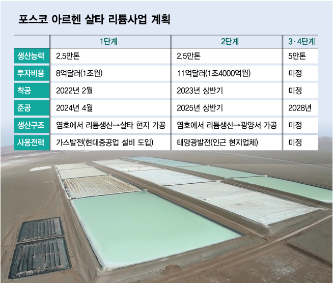 포스코는 2010년 일찌감치 리튬 생산기술 개발에 착수했다. 염수와 광석에서 리튬을 추출하는 기술을 독자 개발하고 2021년 4월 광양 율촌산단에 연 4만3000톤 규모 리튬 생산공장을 착공했다. 2025년 살타 2단계 투자가 마무리되면 포스코의 총 리튬생산량은 10만톤까지 늘어난다. 포스코는 한국과 아르헨티나, 호주 등을 묶어 2030년까지 글로벌 리튬 생산량 30만톤 체제를 완성시킨다는 계획을 세웠다.