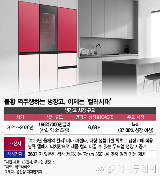 29일 업계에 따르면 글로벌 인플레이션과 구매력 저하로 인한 가전 시장 축소에도 냉장고 시장은 지속 성장한다. 시장조사기업 테크나비오는 글로벌 냉장고 시장이 오는 2026년까지 연평균 6.68% 성장할 것으로 내다봤는데, 증가 규모는 166억 7000만 달러(한화 약 21조원)에 달한다. 성장률의 37%를 담당하는 북미 시장이 견조하고, AI(인공지능) 등 첨단 기술이 적용된 신제품 수요가 지속 상승하면서다.