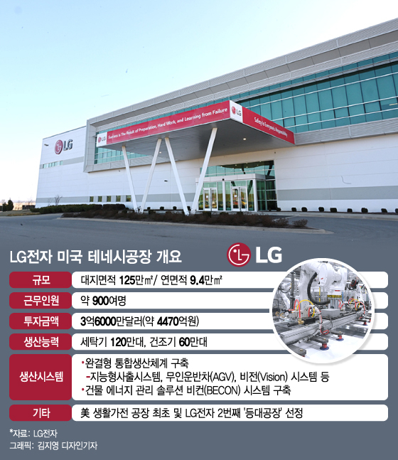 LG전자 테네시공장은 연간 세탁기 120만대, 건조기 60만대를 생산한다. 처음엔 세탁기만 생산했지만 세탁기와 건조기를 세트로 구입하는 북미 소비자들의 소비성향을 반영해 건조기 라인을 추가했다. AI(인공지능), 빅데이터, 사물인터넷(IoT)과 같은 디지털 기술을 도입하고 로봇을 활용해 공정을 자동화하는 등 첨단 제조 기술을 접목했다. 공장의 자동화율은 현재 63%로, 올 연말까지 70% 달성이 목표다.