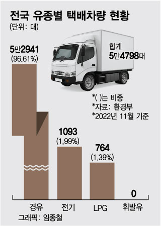 그러나 정계는 물론 완성차 업계에서도 예상치 못한 차량용 반도체 공급난이 2021년에 발생했다. 법 제정 당시에 예측했던 것보다 전기차 충전 인프라 발전 속도가 더뎠다. 환경부에 따르면 지난해 11월 기준 전체 택배차량 5만4798대 중 경유차는 5만2941대로 97%에 달했다. 정부가 친환경차로 분류하는 전기차·LPG차는 이 둘을 합쳐도 2000대가 넘지 못했다.