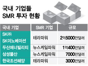 다른 기업들도 발빠르게 움직인다. 두산에너빌리티는 지난 10일 미국 뉴스케일파워의 첫 번째 SMR 프로젝트에 대한 소재 제작 계약을 체결했다고 밝혔다. 아이다호에 건설하는 이 SMR은 총 462MW(77메가와트 6세트) 규모다. 삼성중공업은 지난 1월 SMR의 일종인 소형용융염원자로(CMSR)의 파워 바지 개념 설계를 완료해 미국선급협회(ABS) 인증을 받았다. SK그룹은 테라파워에 2억5000만 달러(약 3000억원)를 투자하며 적극적으로 나서고 있다.