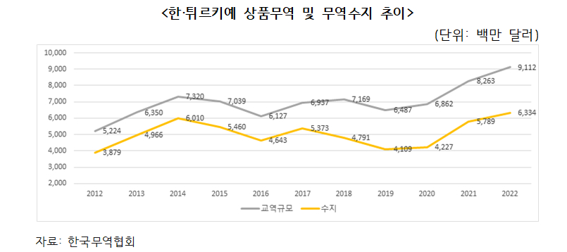 한국의 대튀르키예 무역 흑자는 무역 규모 성장세와 유사한 추이를 보이며 증가세를 지속했다.