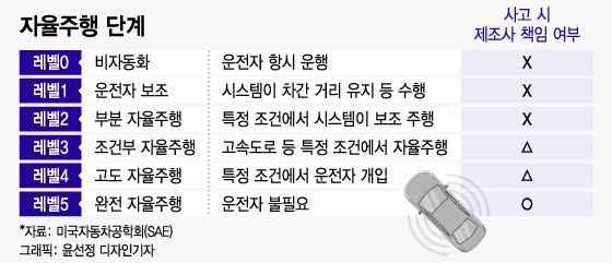 다만 레벨3의 경우 복잡하다. 차량이 자율주행을 할 수 없다고 판단해 운전자에 주도권을 넘겨줄 때 운전자가 이를 제대로 수행하지 않거나 전방주시 의무 같은 안전 수칙을 소홀히 하면 제조사 책임보다 운전자의 책임이 더 클 수 있다.