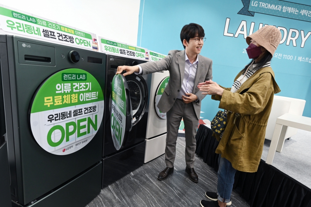 LG전자는 또 '우리동네 셀프 건조방'을 마련했다. 고객들이 탈수를 마친 젖은 빨래를 가지고 LG 베스트샵을 방문하면, '6모션 건조'가 가능한 트롬 건조기를 직접 체험할 수 있다. LG 베스트샵 강서본점, 불광본점, 분당본점, 안양점 등 전국 주요 40여 개 매장에서 셀프 건조방을 이용할 수 있다.