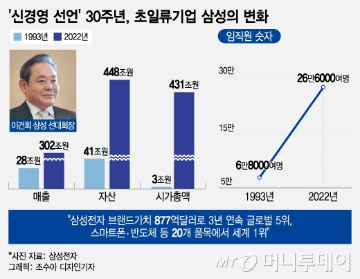 신경영 선언이 있던 해인 1993년 삼성전자의 연간 매출은 약 28조원, 자산은 41조원 규모였다. 시가총액도 3조원 규모에 불과했다. 그러나 현재 연간 매출액 302조원, 자산 448조원(2022년 기준)으로 10배 넘게 불어났다. 시가총액은 431조원, 계열사를 합치면 612조원 규모로 국내 기업 중 1위다. 글로벌 반도체 시장 전체로 시야를 넓혀 봐도 엔비디아, TSMC와 1~3위를 다투고 있다.