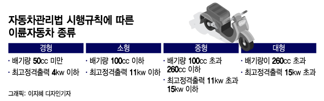 전기오토바이는 국내에서 자동차관리법 시행규칙에 따라 경형, 소형, 중형, 대형으로 종류가 나뉜다. 경형은 최고출력 4kw 이하로 기존 배기량 50cc 급 스쿠터에 해당한다. 소형은 최고출력 11kw 이하, 중형은 11~15kw, 대형은 15kw 초과인 제품이다. 유럽에서는 모빌리티의 종류를 정의한 L카테고리 기준에 따라 전기오토바이를 구분한다. 예를 들어 L1e-B는 50cc 또는 최대 4kw 전력의 이륜차로, 최대 속도 28mph를 넘지 않는 차종을 말한다. L3e-A1는 최대 125cc 및 11kw 출력, L3e-A2는 최대 35kw인 이륜차다.