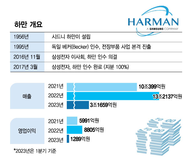 삼성의 전장사업을 주도하는 하만은 디지털 콕핏(디지털화된 자동차 운전 공간), 텔레매틱스(자동차용 통신장비)등 전장부품과 라이프스타일 오디오 등을 생산·판매한다. 주력인 전장사업의 글로벌 시장 점유율은 20%대로 추정되며, 사업장은 미국 노바이(Novi)와 독일 가르힝(Garching) 등에 있다.