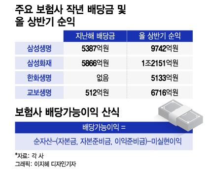 보험사별로 업계 1위사인 삼성생명은 지난해 기준 배당가능이익이 약 10조원이었지만 새 회계기준에 따르면 1조원 수준으로 대폭 쪼그라드는 것으로 추정됐다. 교보생명도 지난해 6조원 수준에서 올해는 1000억~2000억원 가량으로 급감하는 것으로 알려졌다. 한화생명은 배당재원이 아예 사라져 대형 상장사가 3년 연속 배당을 못하는 사태에 직면할 수 있다.