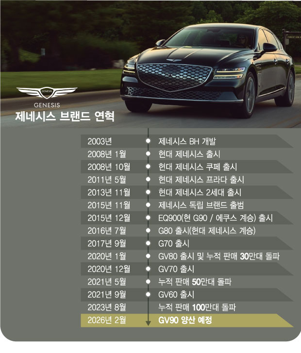 GV90은 2026년 2월 국내에서 양산될 예정이다. 유럽에는 같은해 4월, 북미에서는 6월에 선보일 계획이다. 당초 2025년 말 양산 계획이었으나 최근 사내 품평회 과정에서 일부 제원과 양산 일정을 변경했다. E-GMP에 이어 현대차그룹이 개발한 전기차 전용 플랫폼 'eM'을 장착하는 것으로 알려졌다.