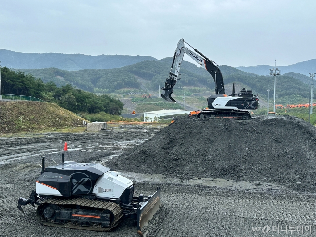 글로벌 건설기계 업계 최초로 원격·무인화 솔루션을 개발한 HD현대사이트솔루션은 지난 20일 HD현대인프라코어 보령PG에서 한층 개선된 건설현장 종합 관제 솔루션 '콘셉트X2(Concept-X2)' 시연회를 개최했다. HD현대인프라코어·HD현대건설기계의 역량을 결집한 콘셉트X는 드론을 통해 지형을 측량한 뒤 저장된 데이터를 자동으로 분석해 공사 계획을 수립하는 무인 건설기계 체계다. 사람이 원격으로 조종하는 수준을 넘어 시스템 스스로 작업을 한다. 콘셉트X 전용 장비는 운전석 자체가 없다.
