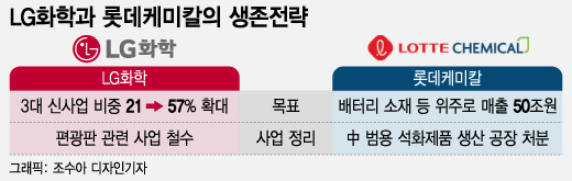 LG화학은 3대 신사업(배터리 소재, 친환경, 신약) 매출 비중을 지난해 21%(6조6000억원)에서 2030년 57%(40조원)로 확대한단 계획이다. 최근들어서는 편광판과 편광판 생산에 필요한 소재사업을 중국 업체에 매각했다. 확보한 자금을 신소재 사업에 투자한다는 방침이다. 롯데케미칼은 배터리 소재 등을 중심으로 사업을 재편해 2030년 매출 50조원 고지에 오르는 게 목표다. 배터리 4대 핵심소재(분리막·전해액·양극박·음극박)를 모두 다룰 수 있는 회사로 환골탈태하는 과정에서, 일부 한계사업을 정리하고 있다.지난 8~9월에는 중국에서 산화에틸렌(EO)을 만드는 롯데삼강케미칼과, 산화에틸렌유도체(EOA)·에탄올아민(ETA)을 생산하는 롯데케미칼자싱을 매각했다. 화학 업계 관계자는 "범용 제품 중에서도 미래 경쟁력을 가질 수 있는 고부가 사업을 선별하는 작업이 각 사별로 이뤄지고 있는 것으로 안다"며 "국내 석화 업계가 살아남기 위해서는 반드시 거쳐가야 할 과정"이라고 말했다.