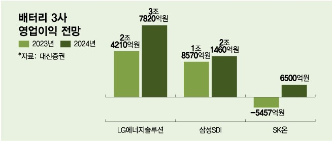 17일 배터리 업계 및 증권가에 따르면 LG에너지솔루션은 2024년에 3조원대의 연간 영업이익을 거둘 것으로 전망된다. 삼성SDI는 2조원대가, SK온은 2021년 출범 이래 최초로 흑자전환이 기대된다.