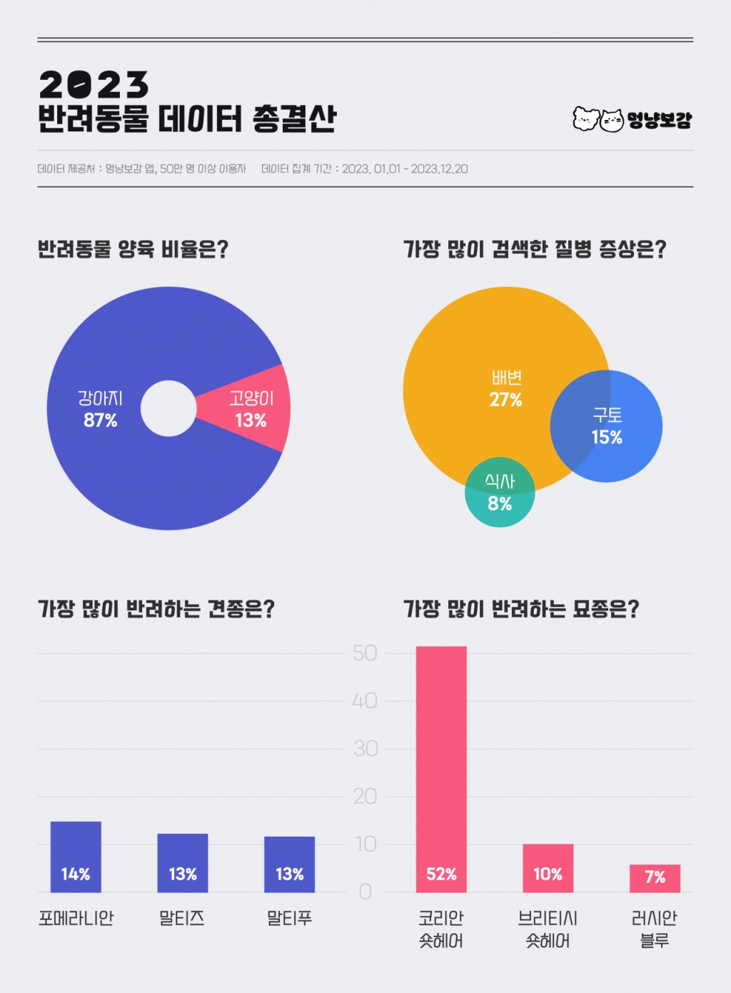 멍냥보감 관계자는 "강아지·고양이 육아 앱 멍냥보감은 2023년에도 반려인들의 육아 고민을 덜어주기 위해 다양한 서비스를 제공했다"며 "앞으로도 반려인과 반려동물 모두 행복한 일상을 보낼 수 있도록 다양한 서비스를 오픈할 예정"이라고 말했다.