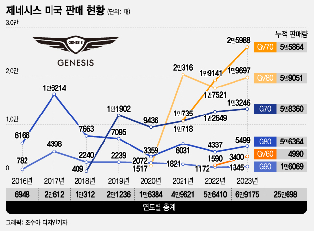 브랜드 출범 이후 약 5년간은 판매량이 1~2만대 선에 머물렀지만 2021년을 기점으로 폭발적으로 증가했다. 제네시스는 2021년부터 GV80·70 등 주력 SUV(스포츠유틸리티차량) 모델을 미국에서 판매하기 시작했는데, 미국 소비자가 선호하는 SUV에 집중하는 전략이 적중한 것으로 풀이된다.