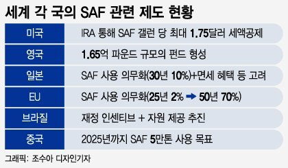 해외도 예외는 아니다. 미국·유럽 등지에서도 SAF를 포함한 바이오연료 시장을 키우기 위한 법안들을 통과시켰고 기업들이 속속 뛰어든다. 유럽연합(EU)은 내년(2%)부터 SAF 의무 사용 비중을 단계적으로 높인다. 2030년 6%, 2035년 20%로 확대한 뒤 2050년 70%로 확대하는 게 목표다. 미국·영국 등은 세제 혜택 또는 펀드 조성을 통해 바이오연료 시장을 후방에서 지원한다. 토탈(Total), 네스테(Neste) 등 글로벌 기업들이 바이오연료 시장에 진입했다.
