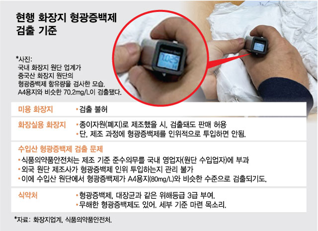 위해성 3등급으로 분류한 형광증백제는 소비자들이 흔히 사용하는 화장실용 화장지에서 검출된다. 현행법상 미용 화장지와 달리 화장실용 화장지의 경우 원료로 재생지 사용을 허용하고 있다. 형광증백제가 사용된 A4 등 다른 재생지가 섞이면서 검출되는 구조다. 발암물질인 포름알데히드의 경우 4mg/L 이하로 기준농도를 정해놨지만 형광증백제는 검출과 불검출만 따진다.