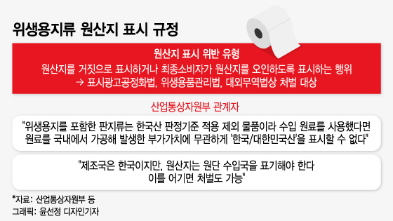 문제는 수입 원단으로 제조한 위생용지가 한국에서 완제품으로 가공된다는 이유로 국산으로 표기돼 판매되는 일이 비일비재하다는 점이다. 원산지 표기 관리의 주무부처인 산업통상자원부는 완제품을 국내에서 만들었더라도 현행 표시광고공정화법와 위생용품관리법 등에 따르면 최종소비자가 원산지를 오인하도록 하면 안되기 때문에 해당 상품들은 "부정 표기"라고 해석한다.