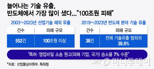 유혹은 느는데 솜방망이 처벌은 계속되다 보니 유출 피해는 더 커진다. 산업통상자원부와 국가정보원 등에 따르면 2003년부터 지난해 7월까지 20년간 발생한 기술유출의 피해 규모는 100조원 정도다. 이 중 상당수가 반도체 업종이다. 지난해 적발된 기술유출 23건 중 15건(65%)이 반도체 관련 기술유출이었다. 업계가 추산하는 지난해 반도체 기술유출 피해액 예상치는 수조원이 넘는다.