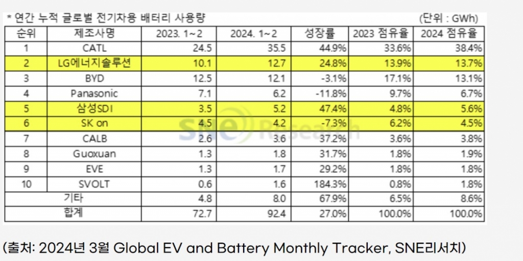 빈자리는 중국 배터리 기업들이 채웠다. CATL은 점유율을 33.6%에서 38.4%로, CALB는 3.6%에서 3.8%로, SVOLT는 0.8%에서 1.8%로 점프했다. 전기차 시장이 캐즘(chasm, 시장 대중화 직전 수요 침체)에 직면한 가운데, 저가 중국산 전기차 및 배터리에 대한 선호도가 강해진 영향으로 분석된다. 최근 유럽의 정책그룹 '교통과 환경'(T&E)은 올해 유럽에서 판매되는 전기차의 4분의1은 중국산일 것이라고 전망했다.