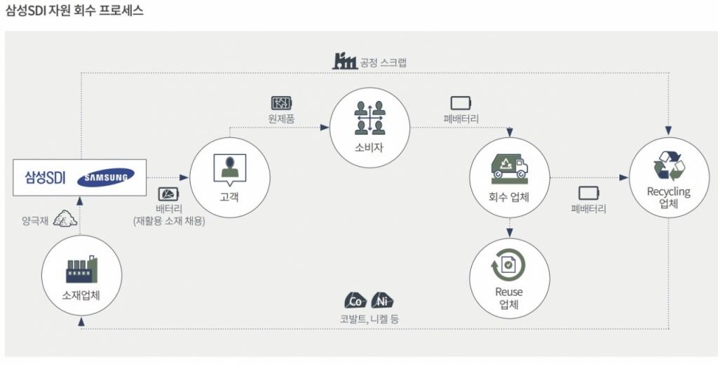 삼성SDI는 국내, 말레이시아, 헝가리 등에 공정 스크랩 회수 체계를 구축했다. 공장에서 발생하는 스크랩을 재활용 전문 기업이 수거한 뒤 니켈·코발트와 같은 광물 원자재를 추출하는 시스템이다. 회수 자원은 배터리 소재 파트너사로 전달된 후 제조 공정에 재투입된다. 사용 후 폐기된 전기차 배터리를 에너지저장장치(ESS) 등 다른 제품의 배터리로 재사용하는 방안 역시 거론된다.