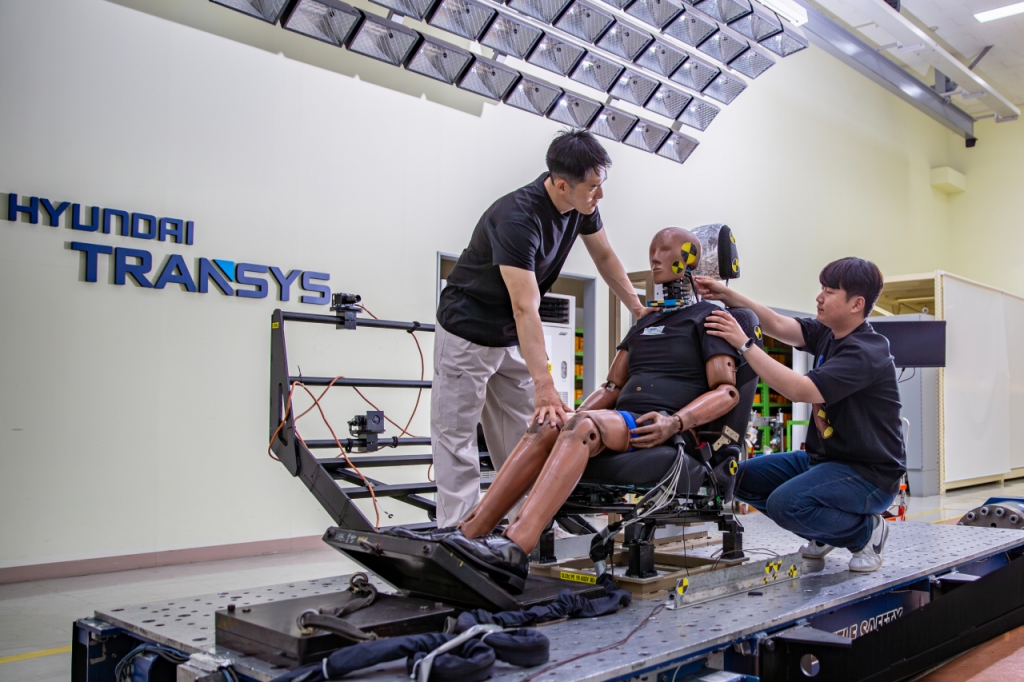 #차량 시트에 앉은 더미(차량 충돌시험에 쓰이는 인체모형)가 팔다리를 크게 휘저으며 앞으로 향했다가 안전벨트에 의해 다시 뒤로 당겨진다. 시속 80km로 달리는 차량이 뒤에서 받을 때를 가정한 현대트랜시스의 슬레드(SLED) 시험이다. 관건은 시트가 버텨주냐다. 시트가 충격을 견디지 못해 원래 상태로 복원되지 못하면 더미는 뒤로 날아가 버린다. 더미의 머리, 목 등 부위에는 센서가 장착돼 얼마나 하중 등이 발생하는지를 측정한다. 시트에 가해지는 충격과 인체에 미치는 상해를 분석해 탑승자의 안전을 위한 설계에 반영한다.