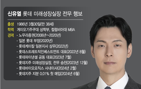 신 전무는 2020년 일본 롯데와 일본 롯데홀딩스에 부장으로 입사하며 회사 경영에 첫발을 내디뎠다. 그해 말 국내 계열사인 롯데케미칼에 입사했고, 2년 만에 상무로 승진했다. 2022년 8월엔 일본 롯데파이낸셜의 최대주주인 롯데스트레티직인베스트먼트(LSI)에 신동빈 회장과 공동 대표에 올랐고, 2023년 7월에는 롯데파이낸셜 대표로 선임됐다.