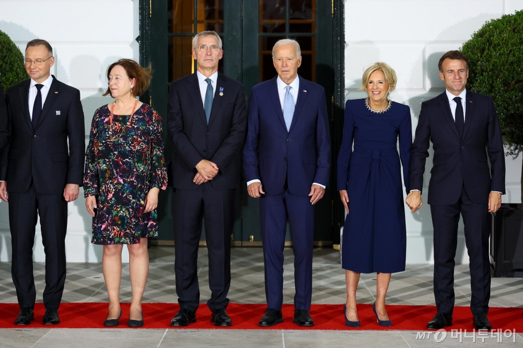 ![[워싱턴=뉴시스] 최진석 기자 = 조 바이든 미국 대통령을 비롯한 각국 정상들이 10일(현지시간) 백악관에서 열린 북대서양조약기구(NATO·나토) 리셉션에 참석하고 있다. 맨 왼쪽은 왼쪽부터 안제이 두다 폴란드 대통령, 왼쪽 세번째는 옌스 스톨텐베르크 나토 사무총장, 조 바이든 미국 대통령, 부인 질 바이든 여사, 에마뉘엘 마크롱 프랑스 대통령. 2024.07.11. myjs@newsis.com /사진=최진석](https://thumb.mt.co.kr/cdn-cgi/image/f=avif/21/2024/07/2024071214290949350_1.jpg)