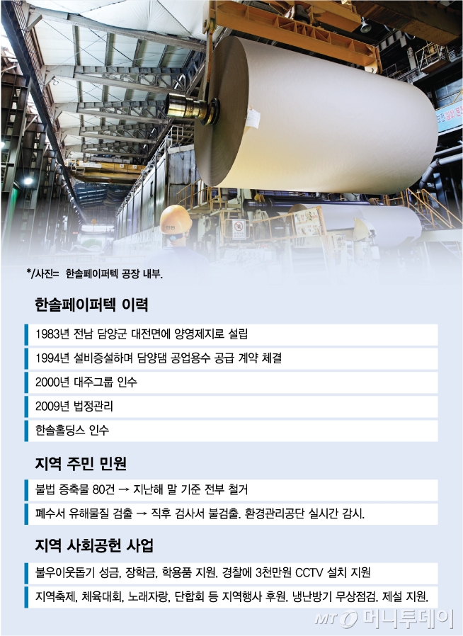 한솔페이퍼텍은 지역 주민을 포함해 300여명을 고용한 회사다. 또 광주·전남 일대에서 노인들이 한달에 수거한 폐지의 절반인 1만5000톤을 소화하고 있다. 회사 자금으로 용산양수장을 증설해 농어촌공사에 기부채납했고, 지역 주민을 위해 전기료 등 제반 운영비도 전액 납부했다. 매년 불우이웃돕기 성금, 장학금, 학용품을 지원하고 담양경찰서의 CCTV 설치 사업에도 참여했다. 공장이 방류한 미온수는 인근 비닐하우스의 난방용수로 공급된다.