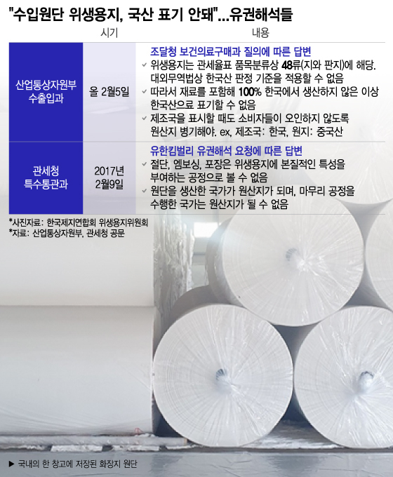 올초에 산업통상자원부가 수입원단 위생용지의 국산 표기는 위법이라고 유권해석한 사실도 뒤늦게 확인됐다.