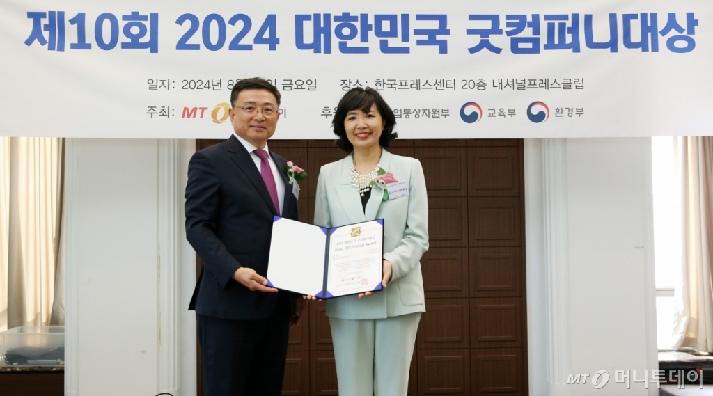 이수민 한국센서연구소 대표(사진 오른쪽)가 23일 오후 서울 중구 한국프레스센터에서 열린 머니투데이 주최의 '2024 제10회 대한민국 굿컴퍼니대상' 시상식에서 '6년 연속상'으로 '저주파 노이즈 분석' 부문 'Good-Technology Award'(굿-기술대상)를 수상하고 이종섭 동국대학교 교수와 기념사진을 촬영 중이다.