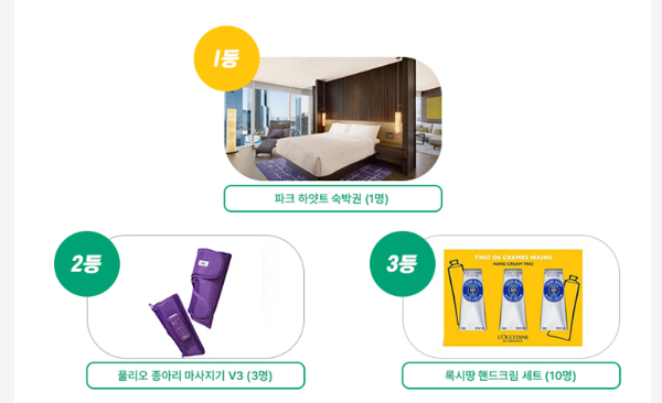 사전등록 경품은 1등 파크 하얏트 숙박권(1명), 2등 풀리오 종아리 마사지기 V3(3명), 3등 록시땅 핸드크림 세트(10명)다. 경품 당첨자는 다음 달 14일 개별 연락을 통해 발표된다. 제세공과금(22%)은 당첨자 부담이고, 경품은 전시회 현장에 방문해 수령할 수 있다.