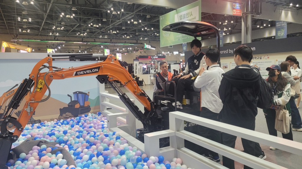 24일 오전 경기 고양시 킨텍스 한국국제건설기계전에서 만난 고은찬군(16)은 디벨론의 전기굴착기 'DX20ZE' 조작 체험을 해본 뒤 이렇게 말했다. 고군은 이날 굴착기의 '암'(굴착기의 팔)을 이리저리 조종해 플라스틱 공을 퍼나르는 체험을 했다. DX20ZE가 실제 산업 현장에서 쓰이는 제품이라는 걸 알게 되자 고군은 "전시용이라 조용한 줄 알았다"며 놀라워했다.