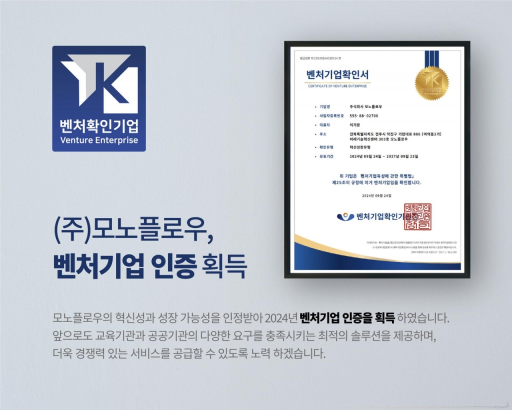 모노플로우 측은 자사 구독형 AI(인공지능) 및 에듀테크 서비스의 독창적인 패키지화 상품과 유연한 구독 기간 설정, 기술적 성장성을 인정받아 이번 인증을 획득했다고 했다.