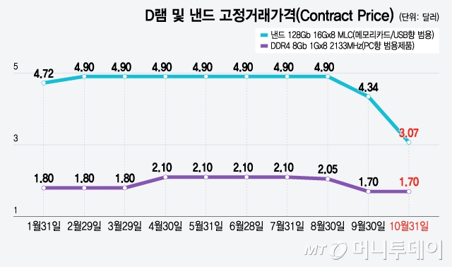 최근 메모리 반도체 가격은 약세를 보이고 있는데, 시장은 내년 상반기 큰 폭의 가격 하락이 나타날 수 있다고 예상한다. 역대급 과잉 재고를 해소하기 위한 움직임이 이어지면서 내년 1분기부터 DDR4 및 낸드의 고정거래가격이 대폭 하락할 것이란 관측이다.