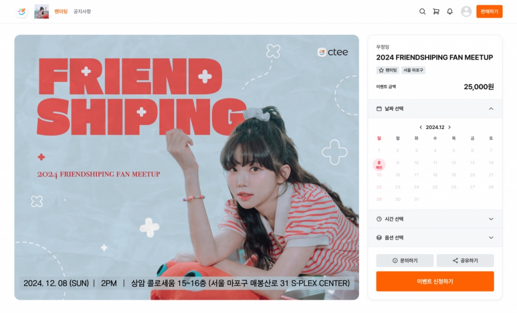 크리에이터 비즈니스 솔루션 '크티(CTEE)'를 이용하고 있는 크리에이터 우정잉의 팬미팅이 30초 만에 매진되었다.