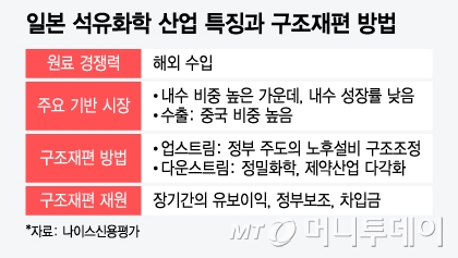 업계에서 주목하는 게 일본의 선례다. K-화학의 추격에 밀리던 일본은 합병, 설비 폐쇄, 용도 전환 등 구조조정으로 위기를 돌파했다. 1지역 당 1사만 남긴다는 원칙을 세우고, 기업 간 통폐합을 추진했다. 이 과정에서 일본 정부는 특정산업구조개선 임시조치법을 시행해 공동 투자·공동 판매 회사 설립, 과잉설비 처리 등을 지원했다.