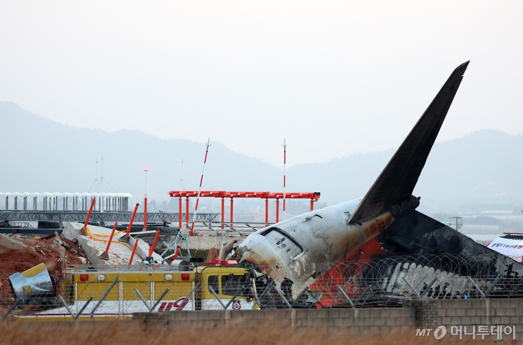 ![[무안=뉴시스] 이영환 기자 = 31일 오전 전남 무안국제공항 제주항공 여객기 충돌 사고 현장에 사고 여객기와 충돌로 부서진 로컬라이저가 보이고 있다. 2024.12.31. 20hwan@newsis.com /사진=이영환](https://thumb.mt.co.kr/cdn-cgi/image/f=avif/21/2024/12/2024123109161833718_1.jpg)