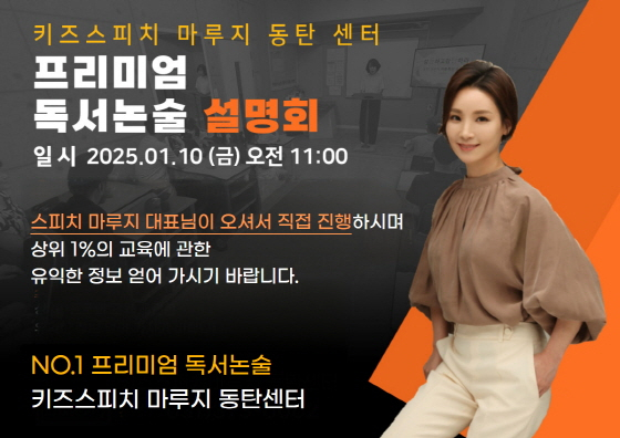 설명회에서는 이지은 키즈스피치 마루지 대표가 △문해력을 키우는 방법 △표현력을 키우는 방법 △학교 토론을 준비하는 방법 △쉬운 글쓰기 & 창의적 글쓰기 등에 대해 설명하고 현장에서 즉문즉답을 받을 예정이다. 다양한 혜택도 준비돼 있다. △선착순 20명 스타벅스 1만원 기프티콘 증정 △설명회 참석 시 10주년 기념 1년간 10% 할인 △융합 스피치(화술 스피치 + 독서 집중 스피치) 22% 할인 △독서 집중 스피치 + 영어 그룹 스피치 22% 할인 등이다. 자세한 정보는 키즈스피치 마루지 동탄센터로 문의하면 된다.