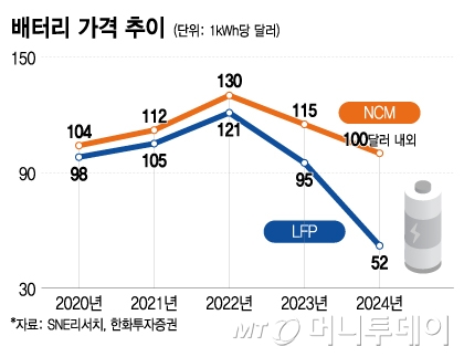 9일 한화투자증권에 따르면 지난달 기준 중국 LFP 배터리 가격은 1kWh(킬로와트시) 당 52달러로 NCM(약 100달러/kWh)의 절반 수준까지 떨어졌다. 가격 격차는 더욱 벌어지는 추세다. 2023년만해도 1kWh 당 NCM 배터리의 가격이 115달러였고, LFP는 95달러였지만 지난해부터 LFP 가격의 하락 추세가 가팔라지기 시작했다. 배터리 업계 관계자는 "중국 배터리 공급과잉으로 LFP 배터리 판가 하락폭이 커진 것"이라고 설명했다.