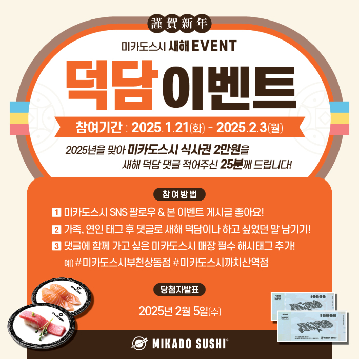 이번 미카도스시 설날 덕담 이벤트의 경품은 댓글을 통해 선정된 25명에게 제공되며, 2만 원 상당의 '미카도스시 식사권'을 선물로 제공한다. 이벤트의 당첨자는 2월 5일(수)에 미카도스시 공식 계정을 통해 개별 DM으로 발표될 예정이다.