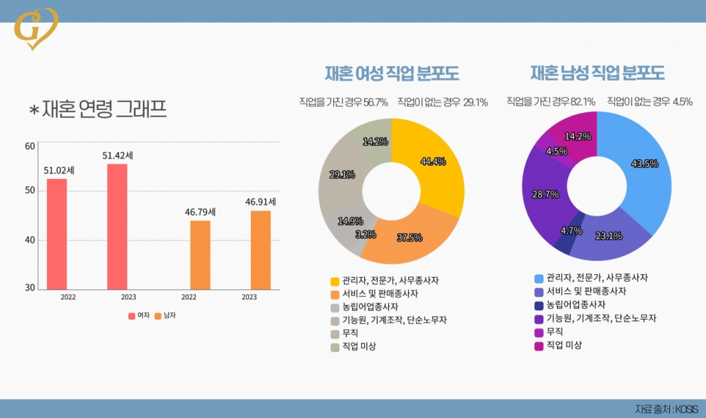 또한, 재혼 시 배우자의 직업 유무도 중요한 요소로 나타났다. 조사 결과, 재혼 여성의 56.7%가 직업을 가지고 있었으며, 직업별 비중은 관리자·전문가·사무종사자 44.4%, 서비스·판매종사자 37.5%, 농림어업종사자 3.2%, 기능원·기계조작·단순노무자 14.9%였다. 직업이 없는 경우는 29.1%, 직업 미상은 14.2%로 집계됐다.