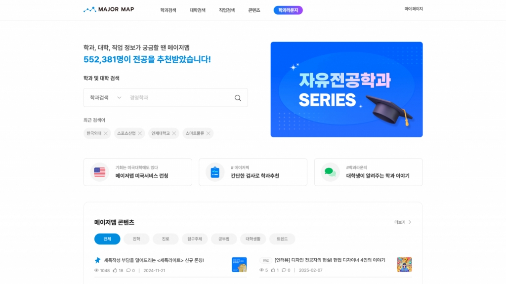 메이저맵은 무료 웹서비스 및 진로정보플랫폼으로 꾸준한 성장 및 호응을 얻고 있다고 밝혔다. 메이저 맵은 전국 4년제 대학의 학과와 직업정보를 표준화하고, 진로탐색에 유용한 콘텐츠를 제공하는 무료 웹서비스다.