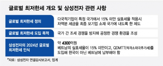 삼성전자는 "베트남의 유효세율이 15% 미만"이라며 "베트남의 QDMTT 도입에 따라 해당 법인세를 당기 법인세 비용으로 인식하고 있다"고 밝혔다. 베트남에서 내는 추가 세금 외 다른 글로벌 최저한세 관련 사안에 대해선 "영향 금액이 없거나 미미할 것"이라고 했다.